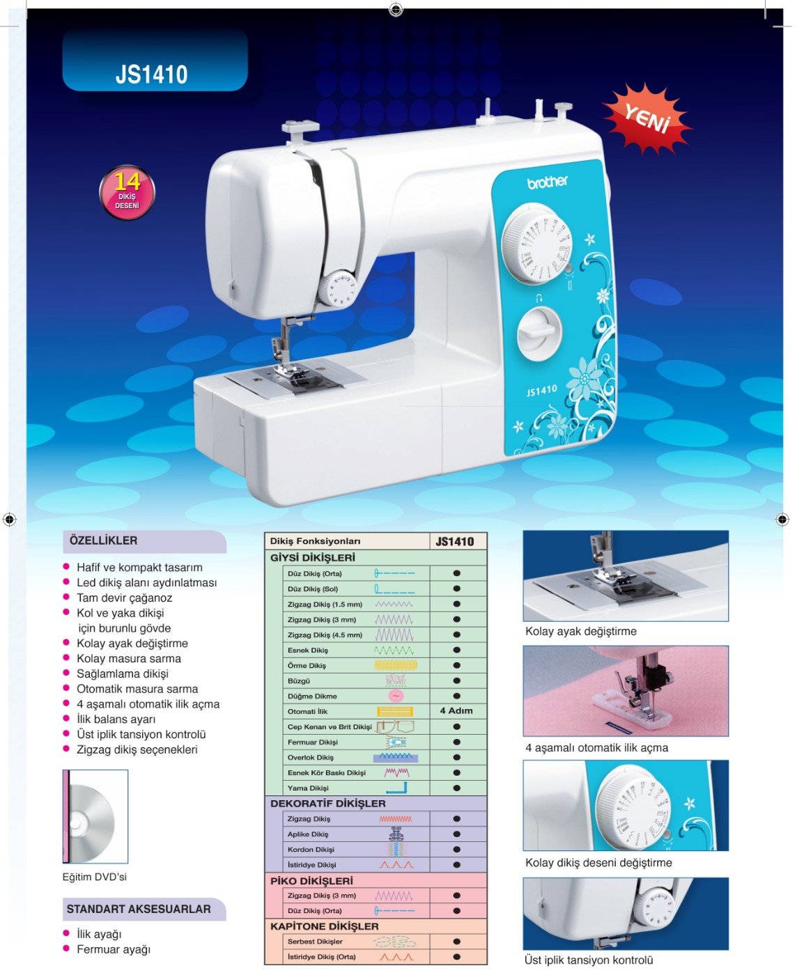 Kompakt ve kullanımı kolay JS1410 dikiş ve onarım için kusursuzdur. 14 dikiş stili, 4 adımda düğme deliği ile dikiş genişlik ve uzunluğunu otomatik ayarlama özelliklerine sahiptir. Serbest kollu dikiş yüzeyi manşetler ve elbise kolları dikmek için geleneksel düz yataktan kolayca serbest kolluya çevrilebilir. Ayrıca parlak aydınlıkta dikiş için dikiş lambası ve kolay kurulum, kolay bakım ve net görüş için yukarıdan yüklenen bobin özellikleri sunar. JS1410, sizi adım adım dikişe hazırlayan dikişe harika bir başlangıç için gerekli tüm talimatları içeren bir DVD ile gelir.